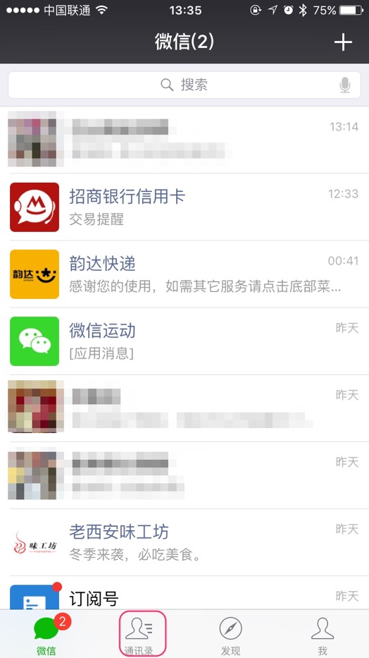 打开微信首屏幕显示的是您曾经聊过天的朋友和服务号,现在点屏幕下方的“通信录“按钮