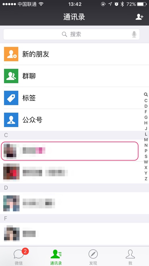 通信录界面显示您所有好友的列表,选择您要聊天的对象并点击