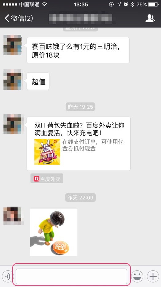 此时会进入微信聊天界面,您可以向对方发送文字、语音信息或分享照片、视频等内容。点界面下方红色线框区域
