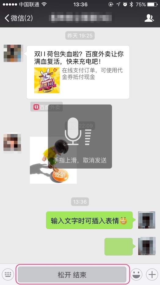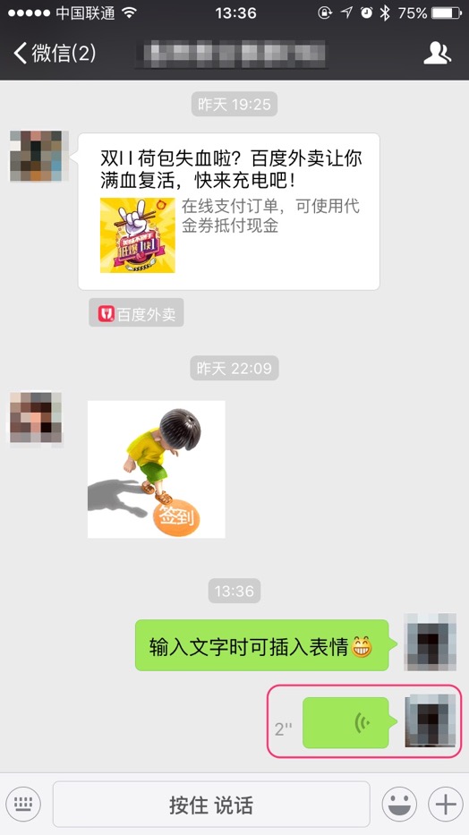 当您要结束发言时松开手指,语音信息就会发送给您的聊天对象,您发送的语音时长会显示在左侧,这次一共说了2秒。