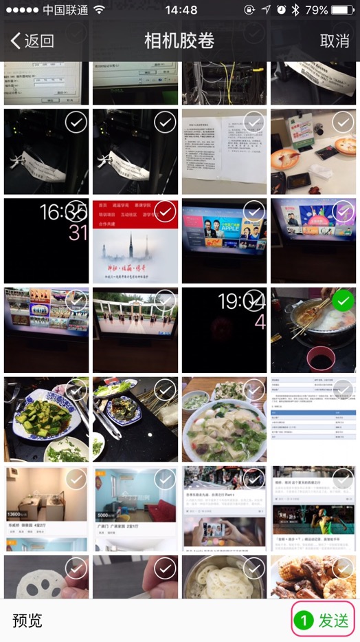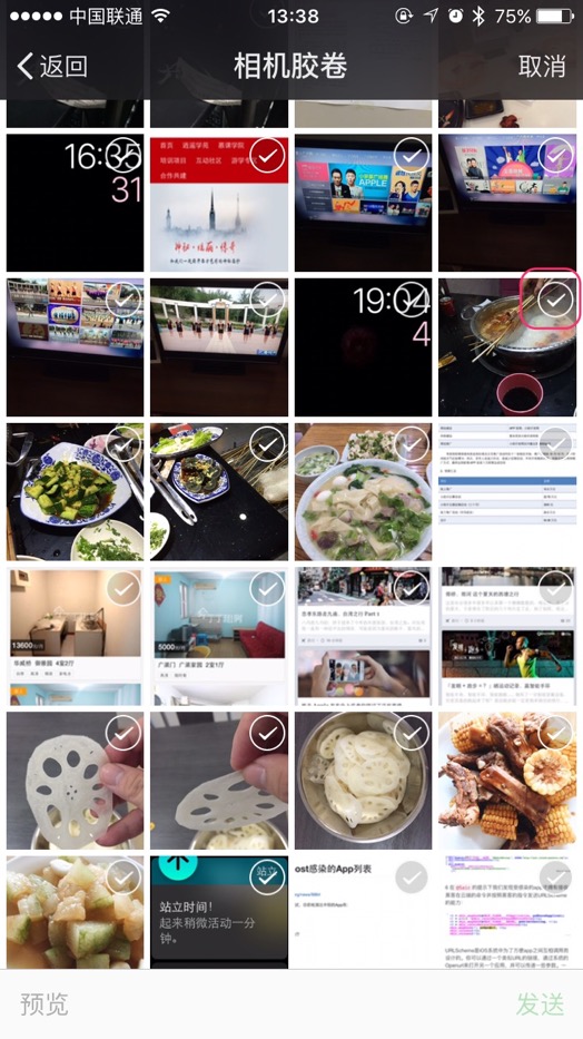 界面将显示您手机中的照片,点您要发送照片右上角的白色“对勾”图标选择照片