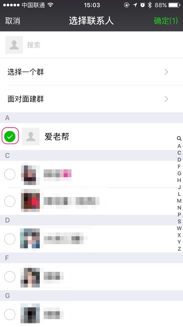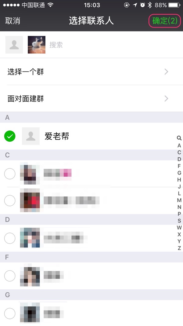 可选择一次选择多个联系人(好友),这里选择了两人,选好后点屏幕右上角的“确定”按钮