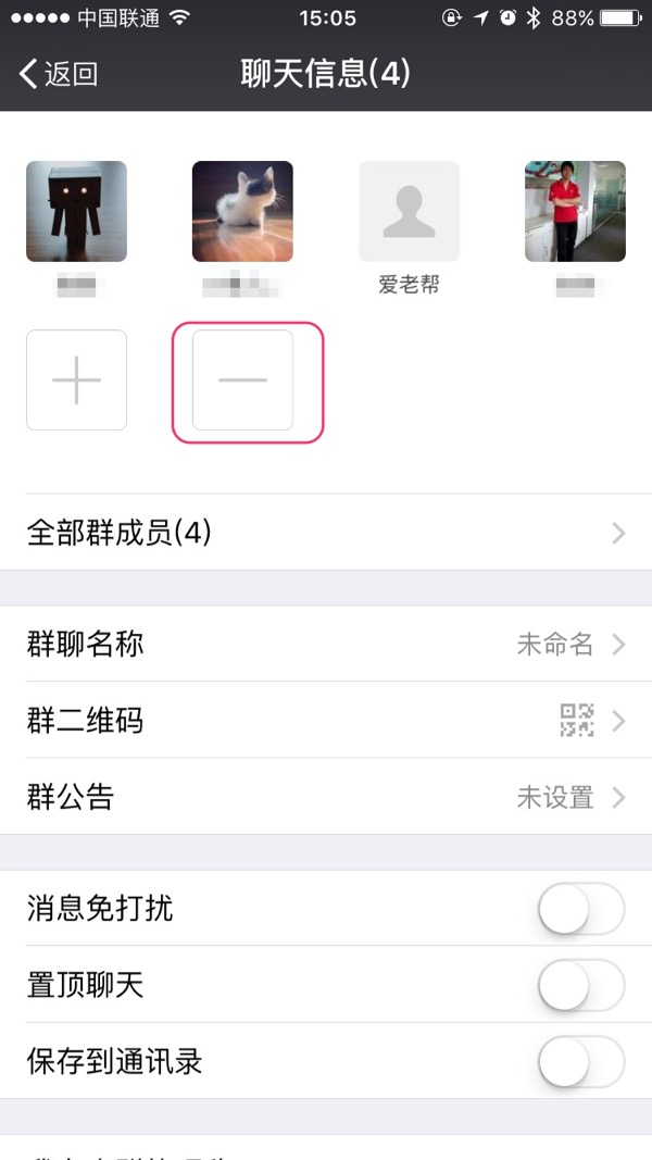 要删除成员请在“聊天信息”界面点击“减号”按钮