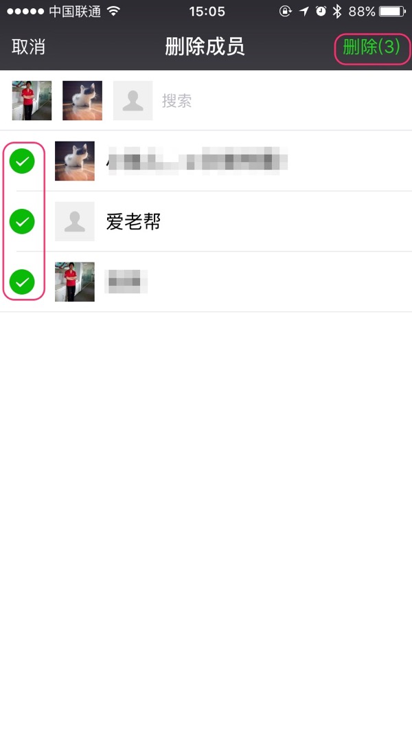 界面将跳转到“删除成员”,点击要删除成员左侧的圆圈,使之变为“”绿色对勾“”图标,全部选好后,点界面右上角的“删除”按钮
