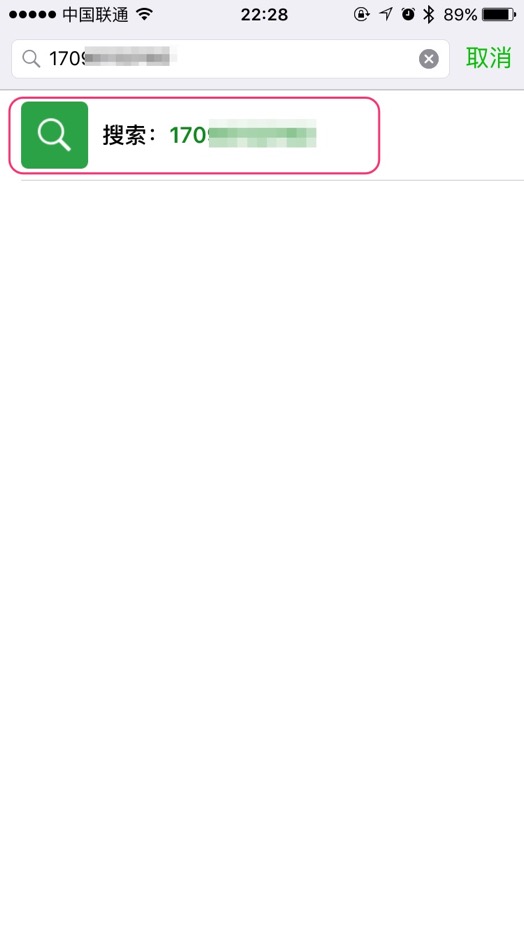 输入您好友的微信用户名(不是昵称)、手机号或QQ号码,这里输入一个手机号“170xxxxxx”,此时界面中会出现“搜索170xxxxxx”字样,点击可开始搜索