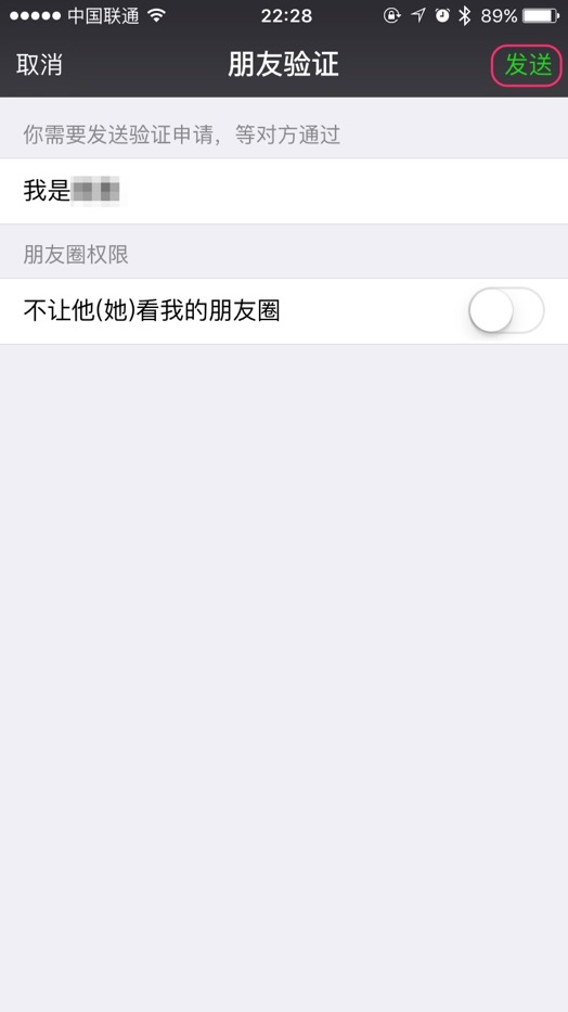 默认情况下如果您要添加一个微信好友需要对方的认可,输入一些对方可以确认您身份的信息比如您的姓名,然后点界面右上角的“发送”