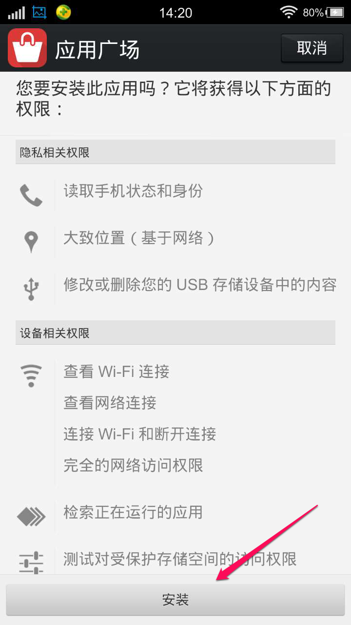 提示安装权限。选择“安装”
