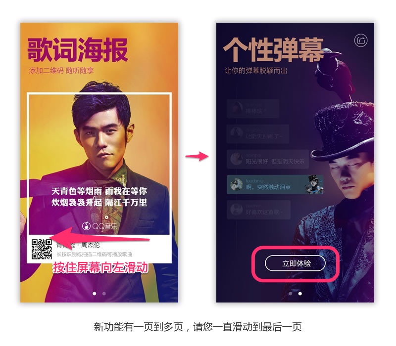 当您第一次或更新版本后第一次打开“QQ音乐”一般会显示一个新功能介绍,这是一个多页的内容,请按住屏幕向左滑动,一直到最后一页,界面中会有一个“立刻体验”按钮,点它进入App