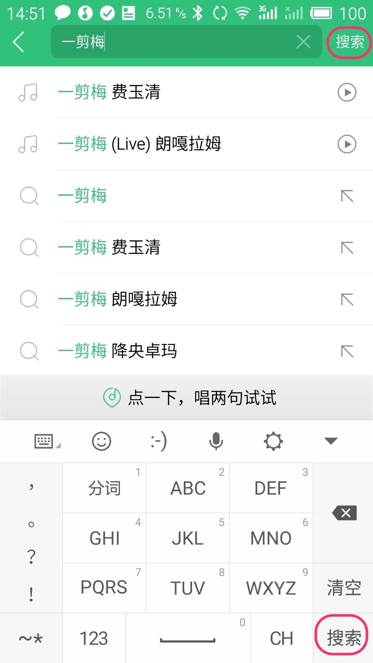 这里我们输入“一剪梅”,输入好后点界面右下角的“搜索”按钮(在键盘右下角)