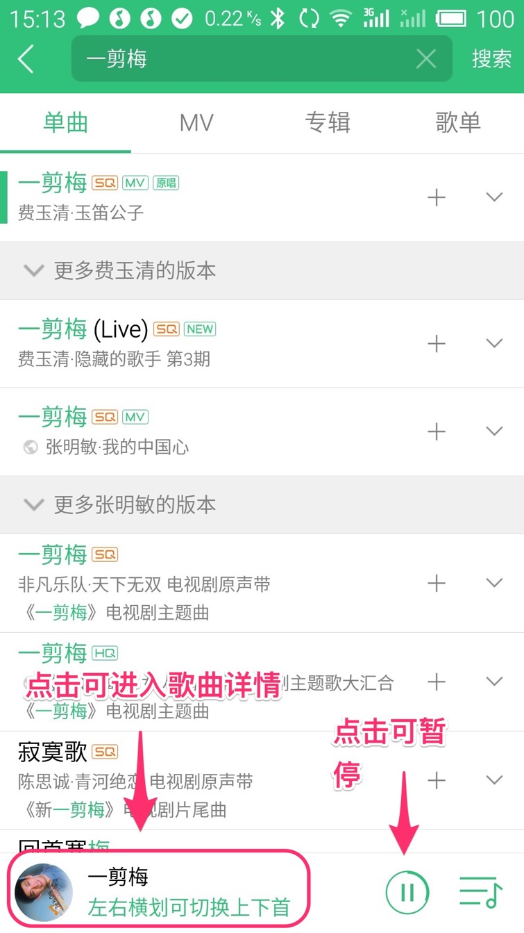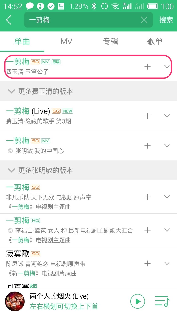 “QQ音乐”会按照您输入的关键字搜索音乐并显示搜索结果,搜索结果按照演唱者分类显示,可以看到“一剪梅”有多名歌手演唱过,选择您想听的版本点击即可在线试听,我们现在点结果中的第一条,由费玉清演唱