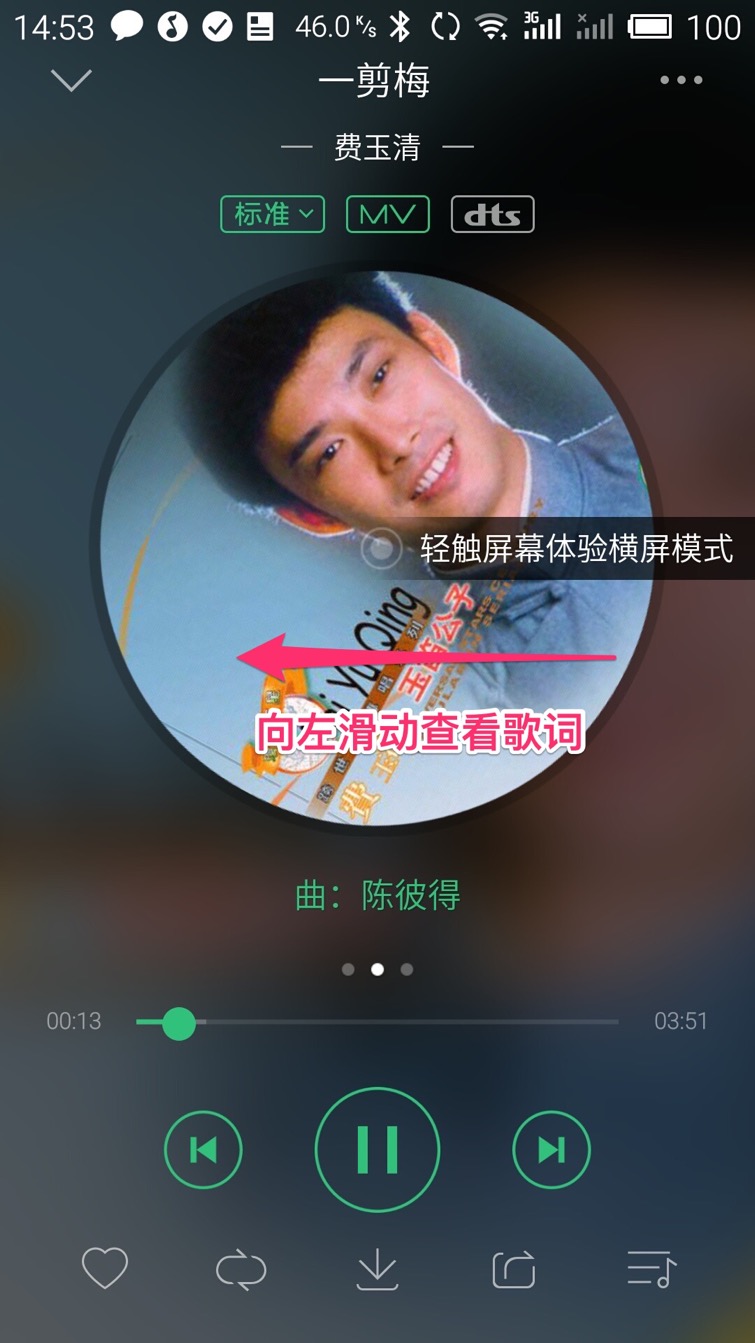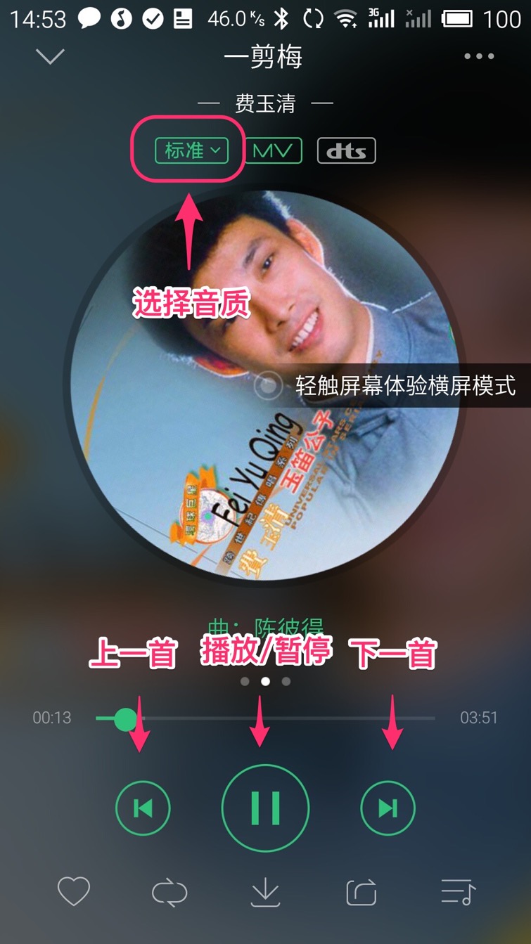 在播放器界面下方有三个绿色的按钮,从左到右分别是上一首、播放/暂停、下一首。上边是播放进度,您可滑动进度内的原点快进或快退,再上面是正在播放音乐的封面,您可以设置在线试听的品质,要设置品质请点击封面图上方三个方形按钮最左边的一个,图中显示为:“标准”