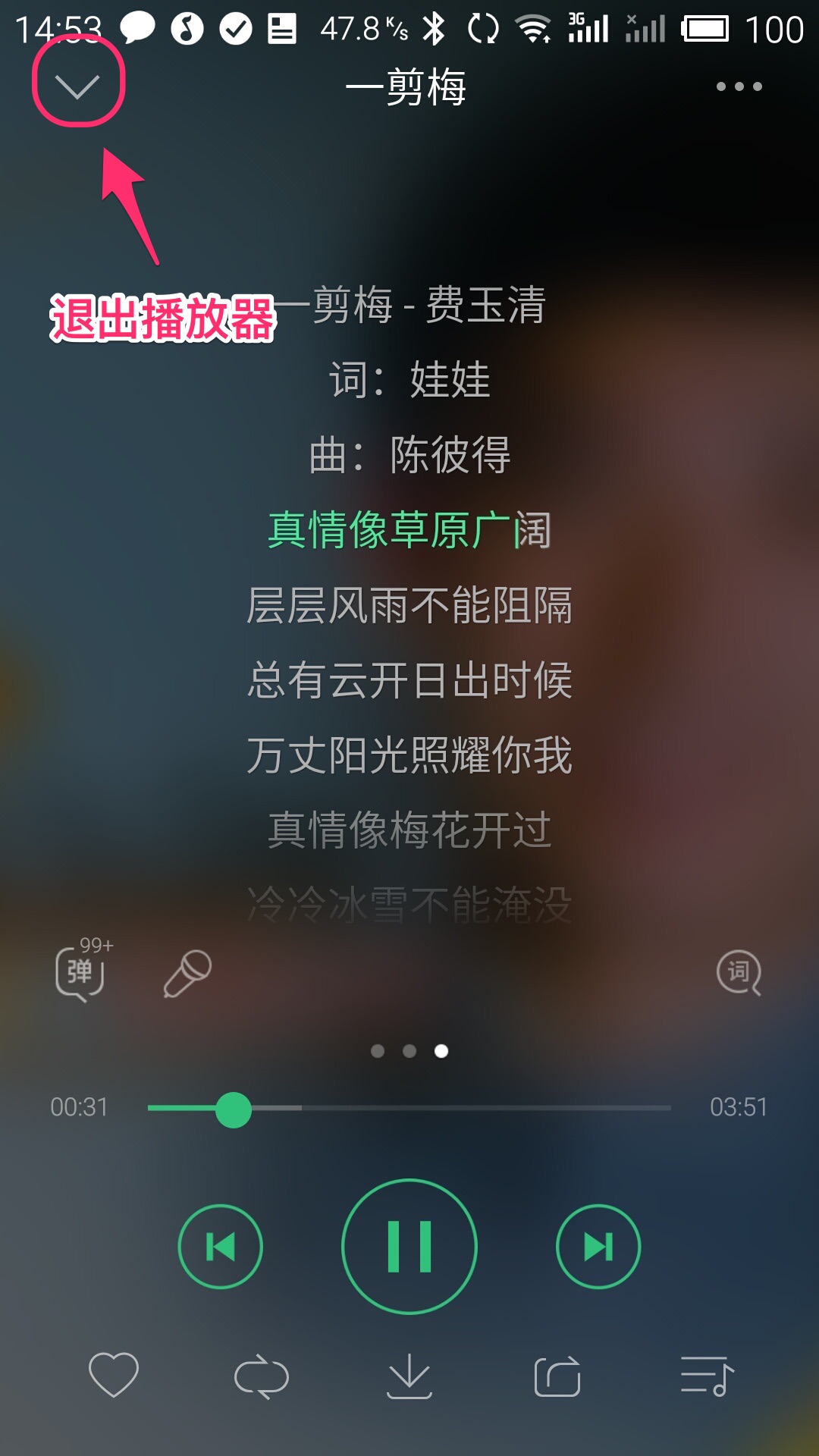 界面中将显示歌词,歌词会按照音乐播放进度自动滚动。如果您想退出播放器界面,点界面左上角的“向下箭头”即可最小化播放器界面