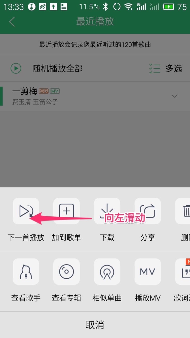 如果您想查看音乐的歌词,请向左滑动播放器界面(按住后向左移动)