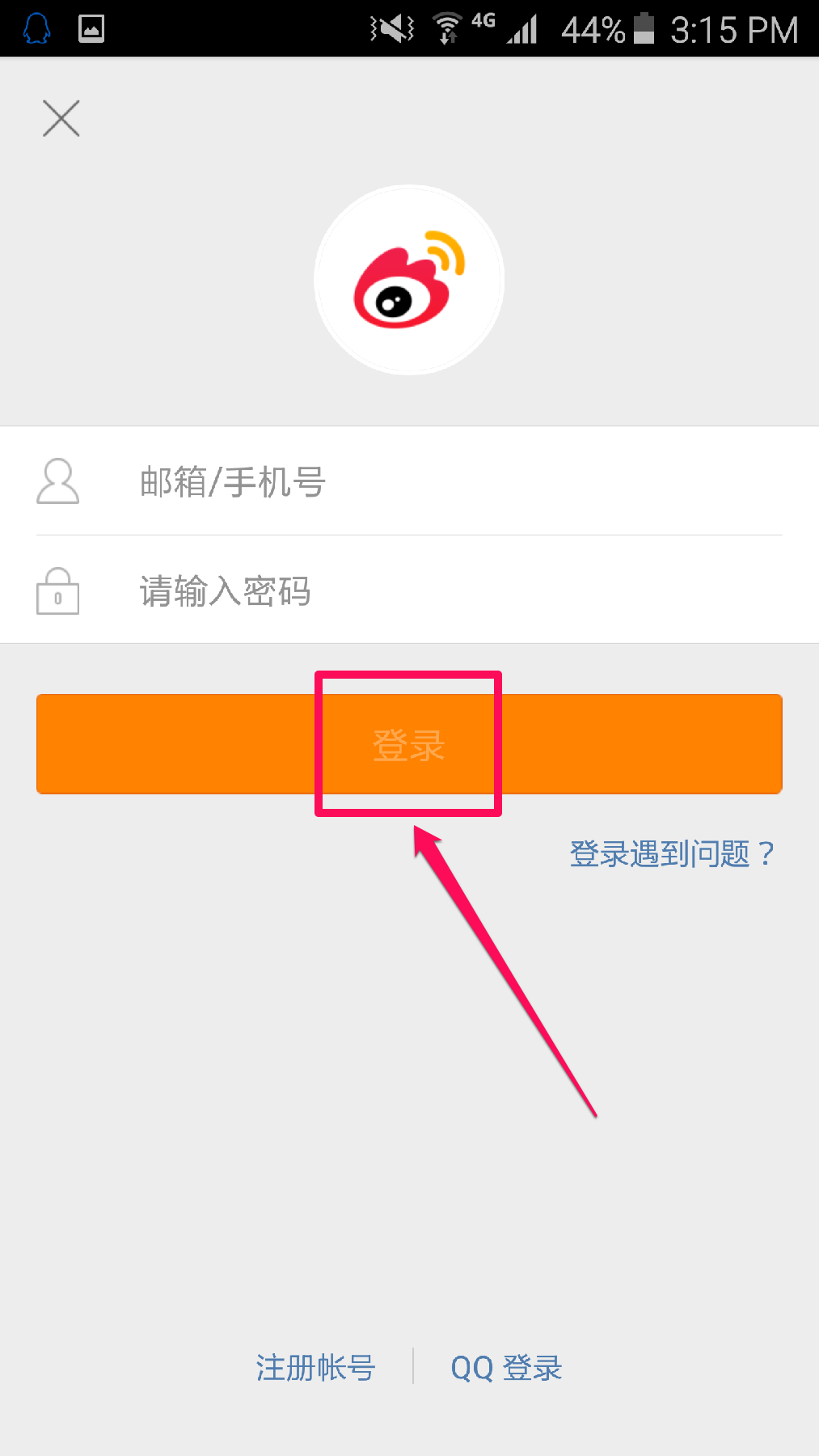 点击手机微博,输入您注册微博时的邮箱或手机号,并输入密码,点击”登录“