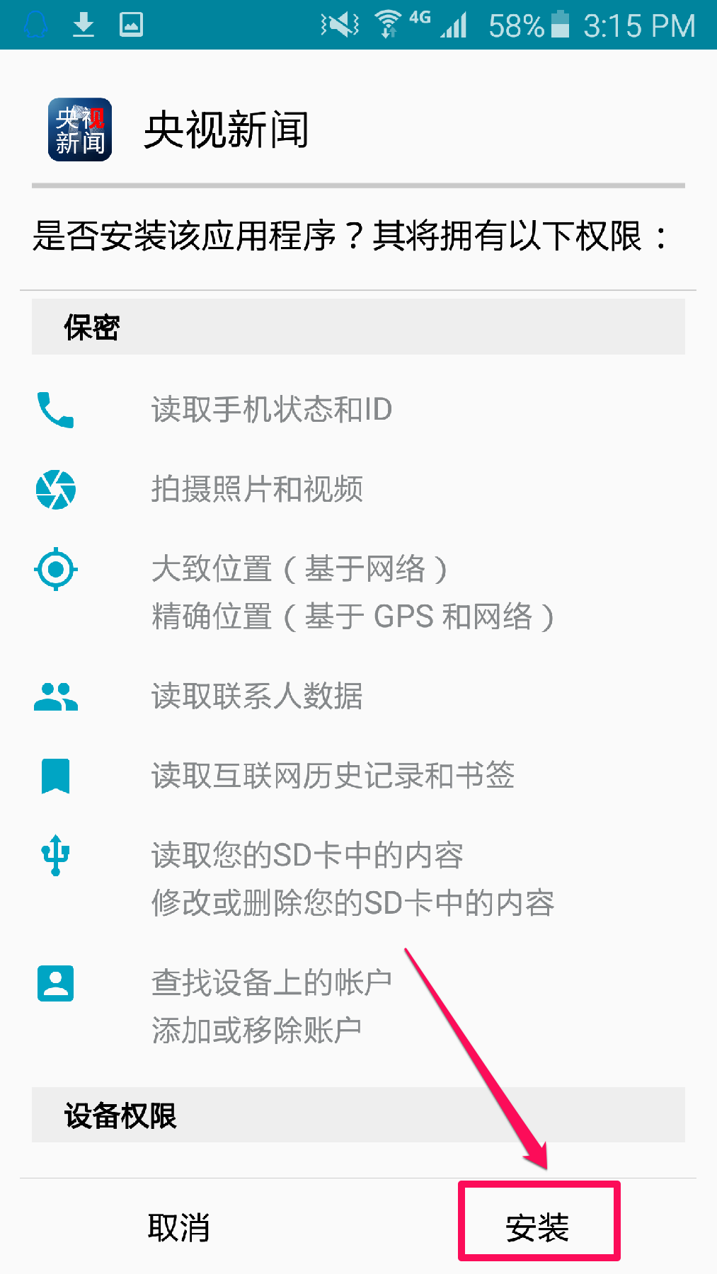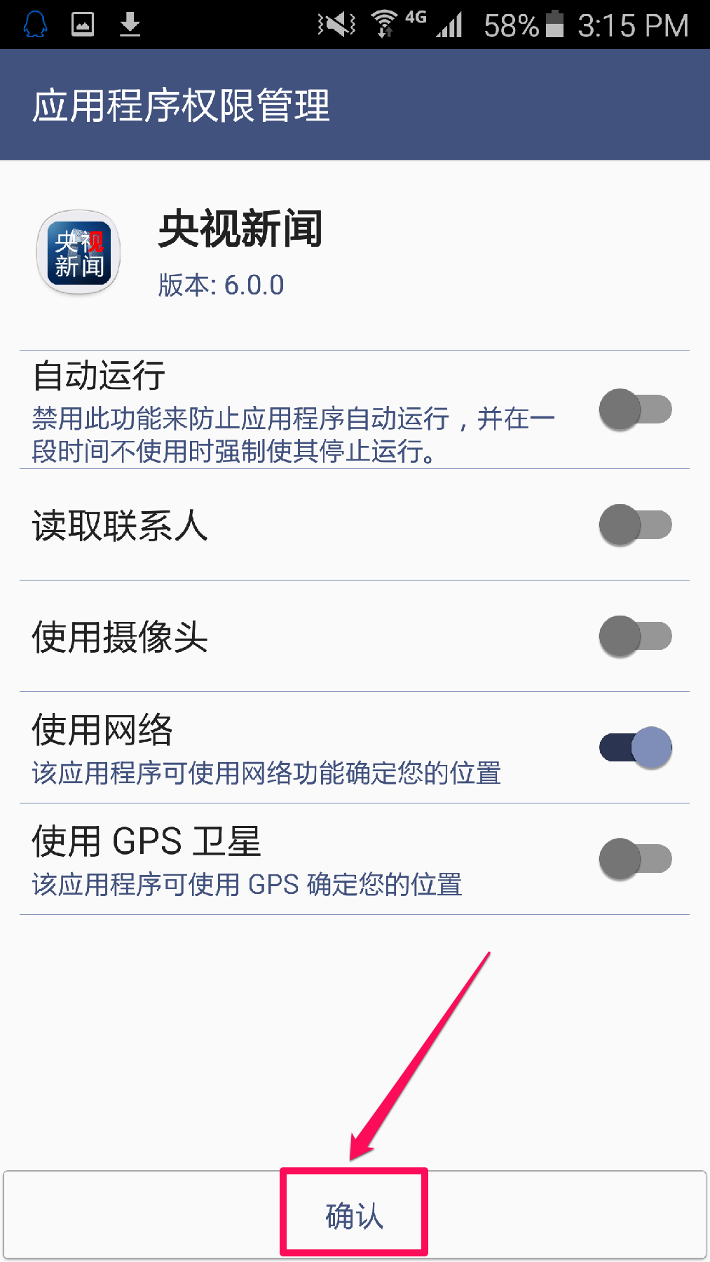 根据您的使用需要,选择”央视新闻客户端“可以拥有的权限。这里我们建议您只保留使用网络的权限。选好后点击“确认”