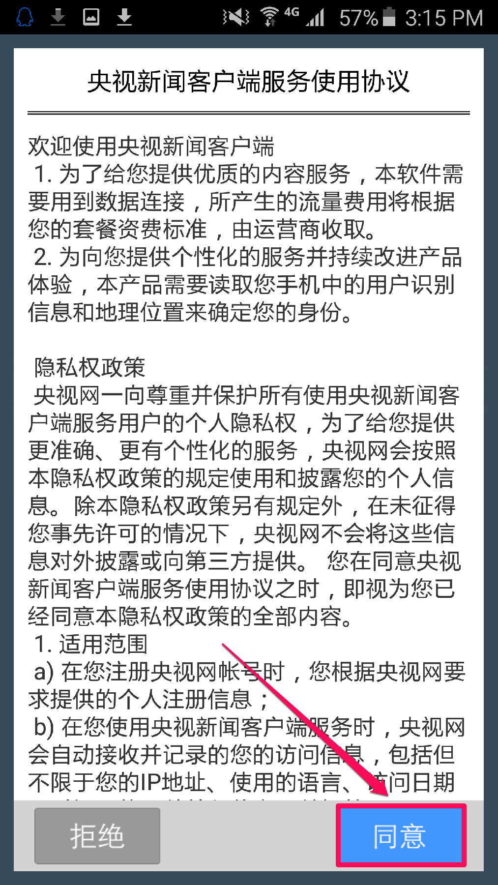 首次打开”央视新闻客户端“,需要您阅读使用协议。请点击“同意”
