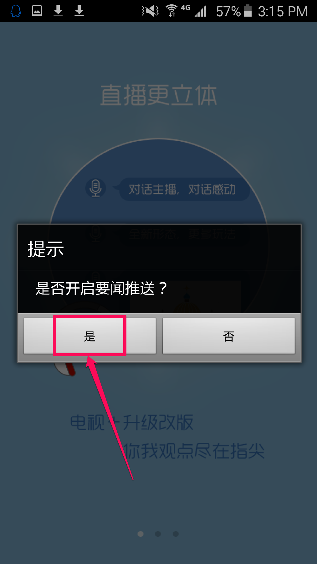 询问您是否需要开启要闻推送。这是“央视新闻客户端”的一项特别功能,当发生要闻时,该客户端会通过网络向您的手机发出提醒,您可以在有网络的情况下接收到要闻推送通知。点击“是”
