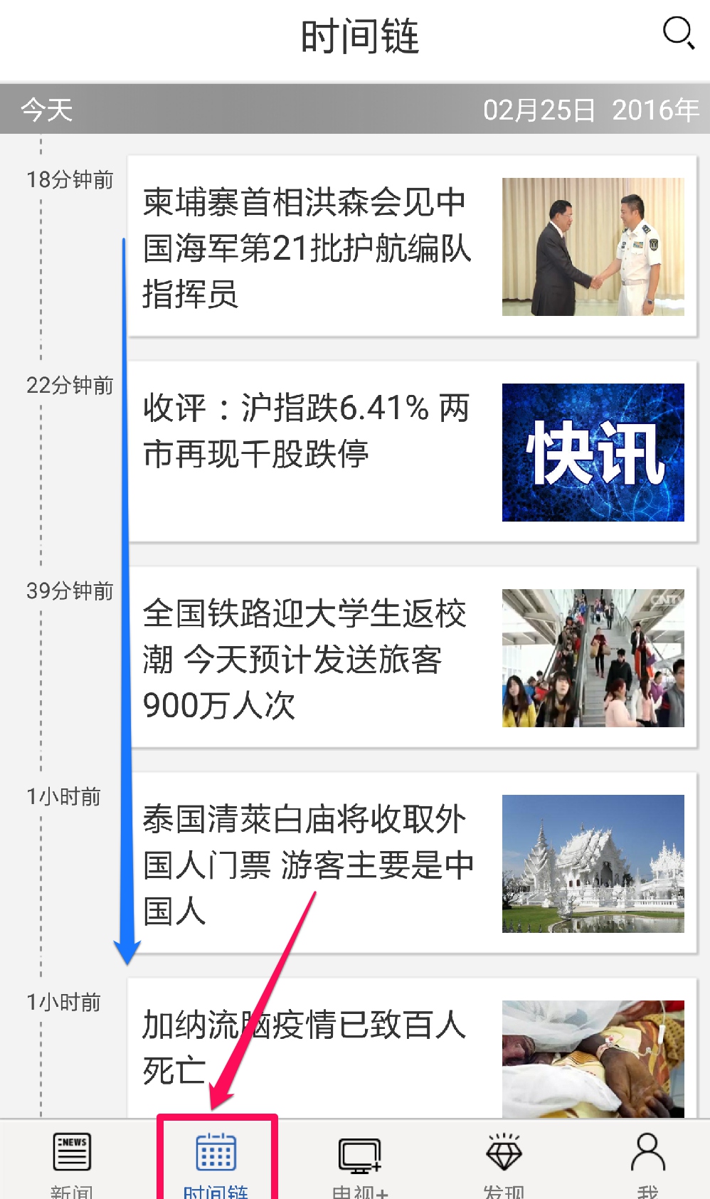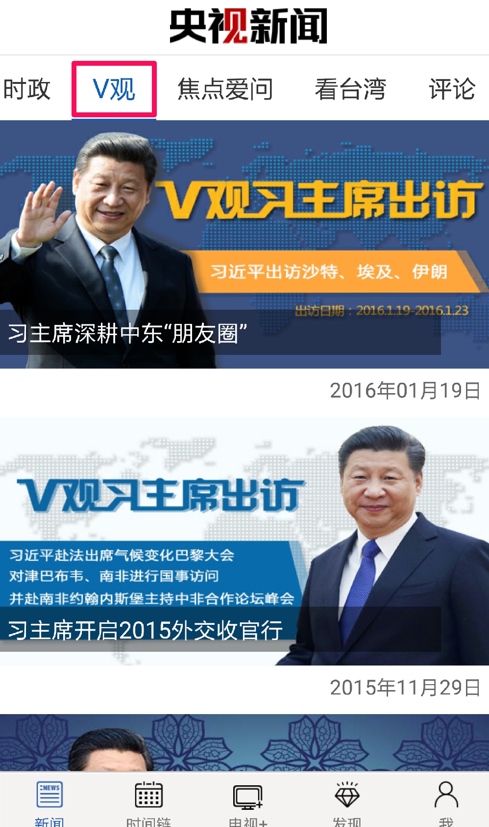 “电视+”是浏览视频新闻的栏目。在这里,您可以选择中央电视台的各频道直播节目,也可以选看其他时间段的以往节目。在下方选好栏目后,点击上面的播放按钮,即可开始看电视
