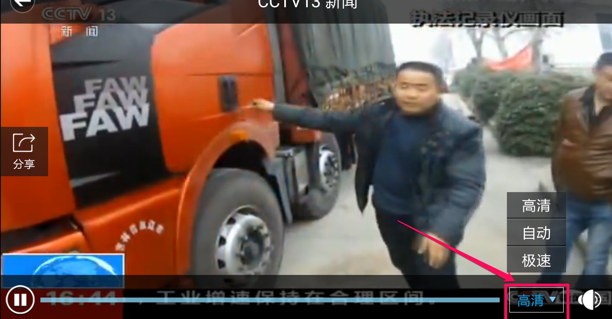 在全屏模式中,点击右下角的视频清晰度按钮,可以选择视频不同的清晰度。高清最清楚,但是消耗的网络流量较大。极速可以使视频缓冲速度最快,但视频清晰度会有所下降
