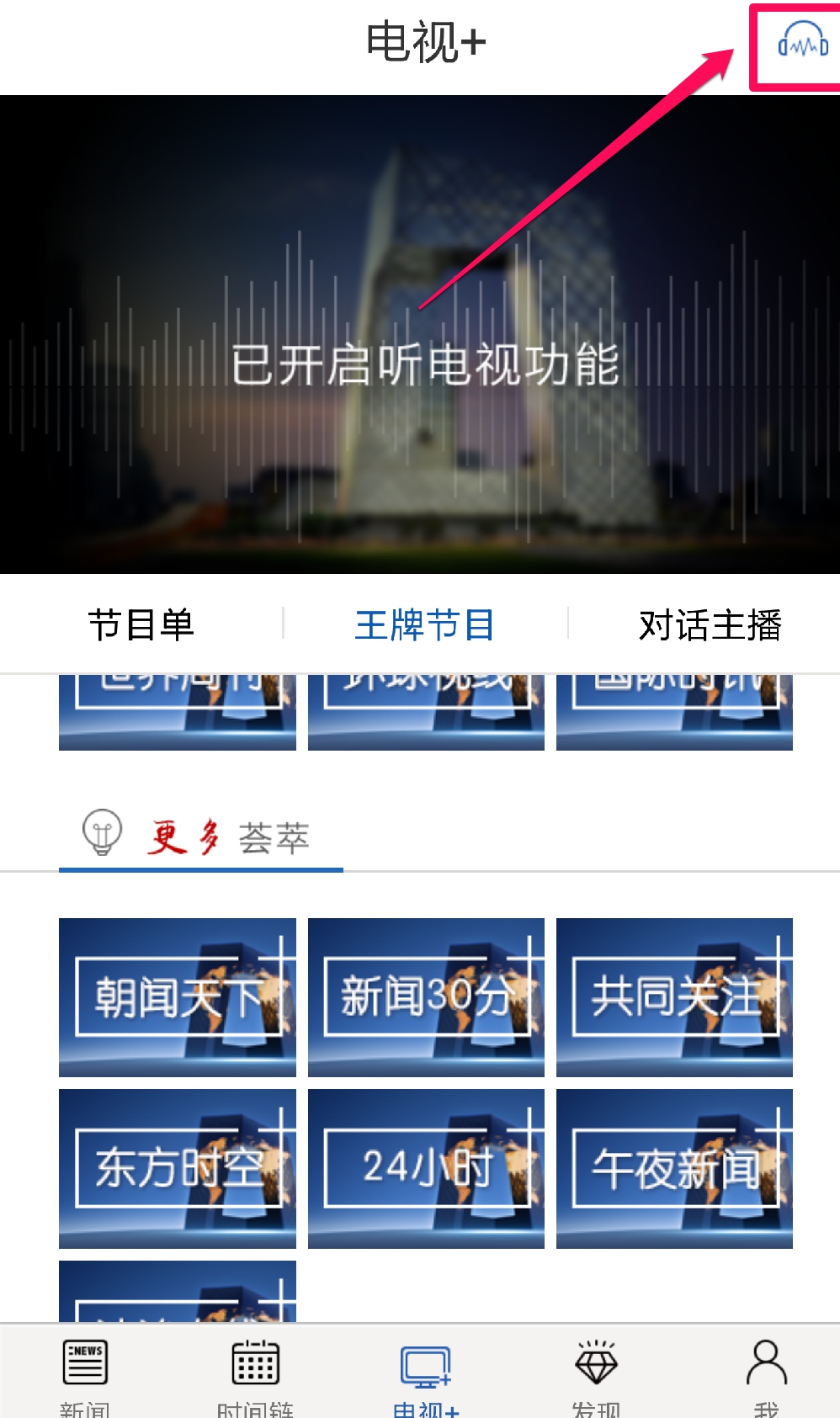 点击右上角的耳机按钮,可以打开“听电视”功能。这是一个帮您“听”电视节目的功能,打开之后可以在切换到其他软件时(不退出央视新闻客户端),依然在后台播放央视电视节目的音频,方便您在使用其他软件时也能随时关注新闻动态。再次点击这个耳机按钮,可以关闭听电视功能