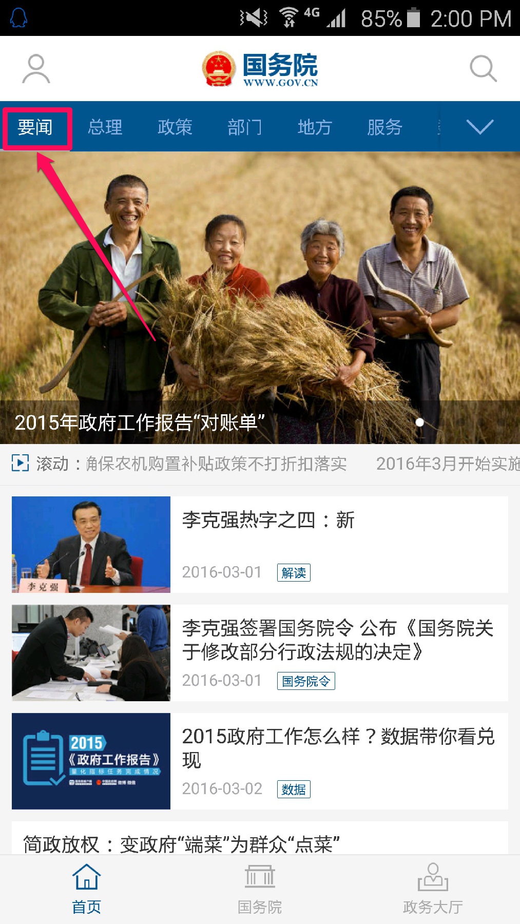在首页顶部可以选择浏览类别。选择“要闻”,可以查看政府发布的最新重要新闻