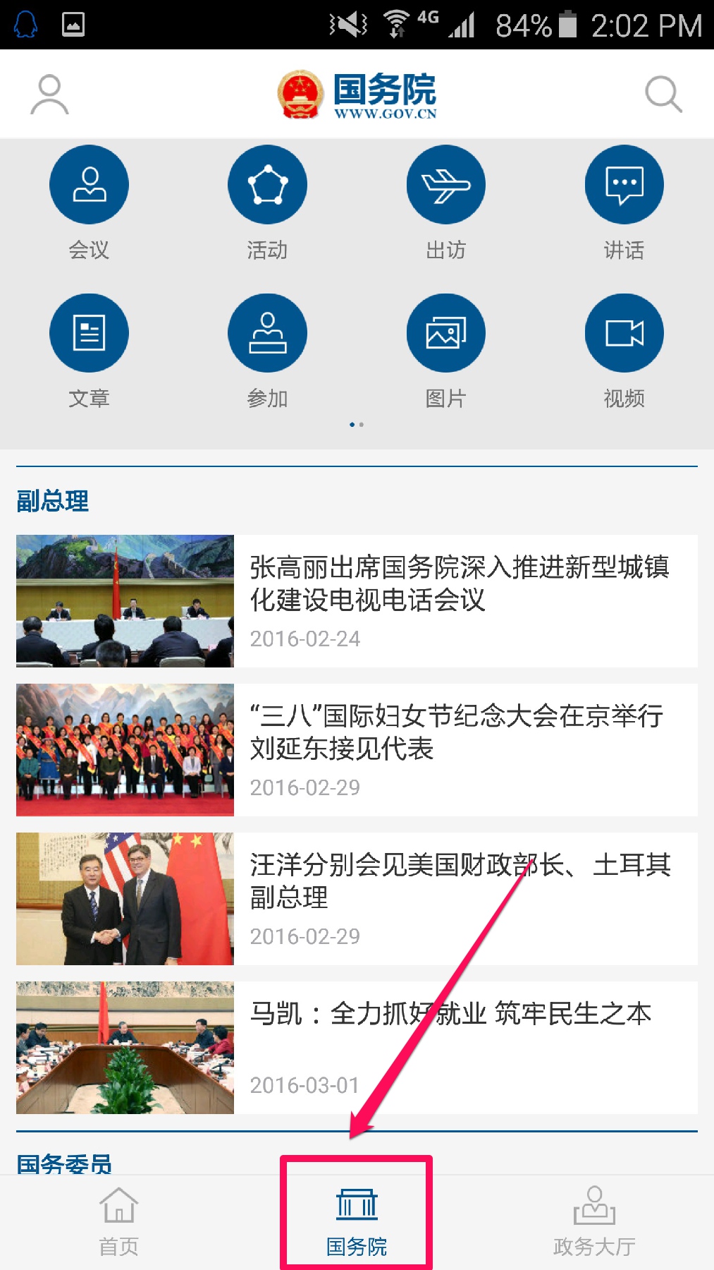 点击“总理”,可以查看关于李克强总理的重要出访、讲话、文件等