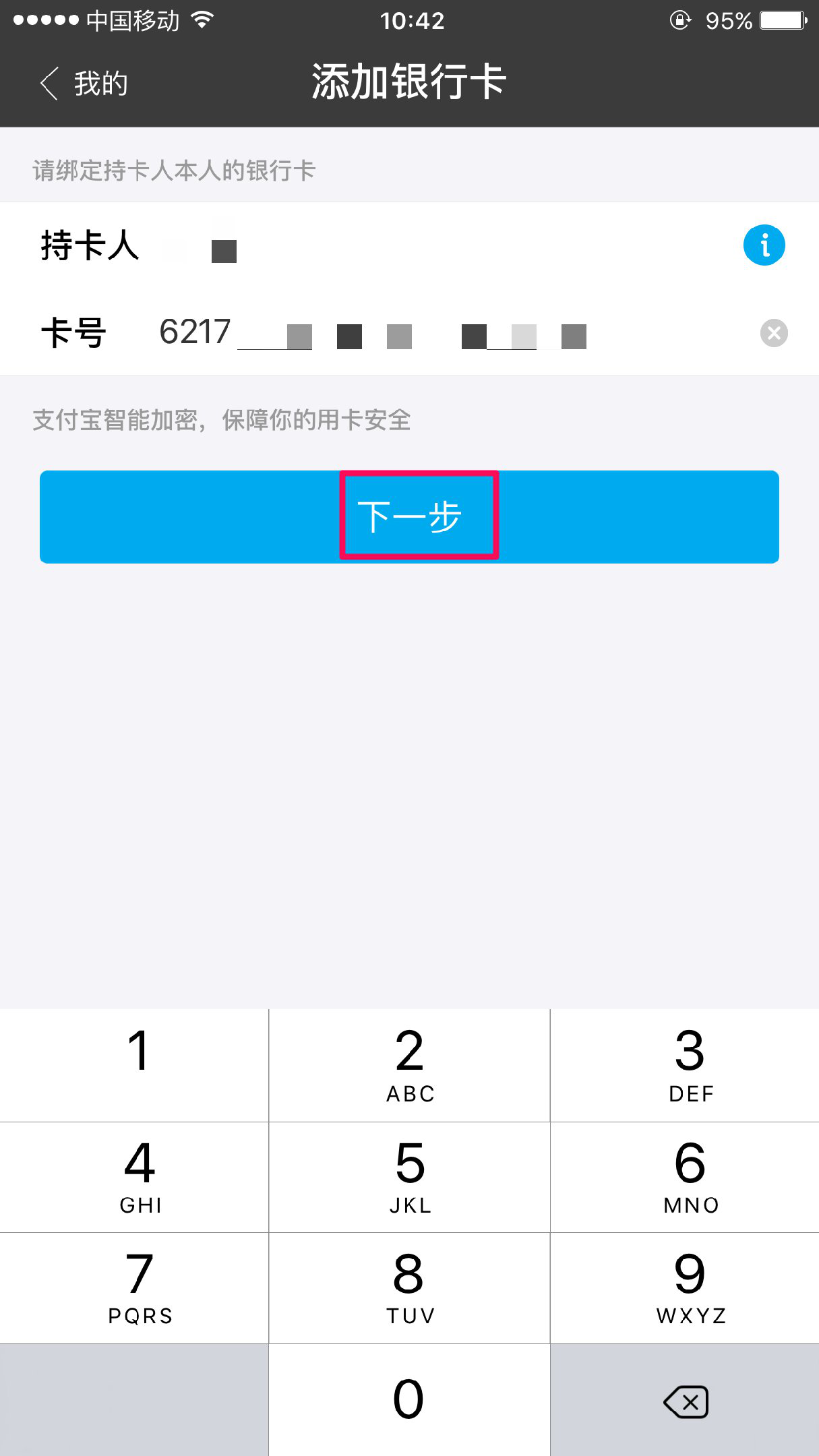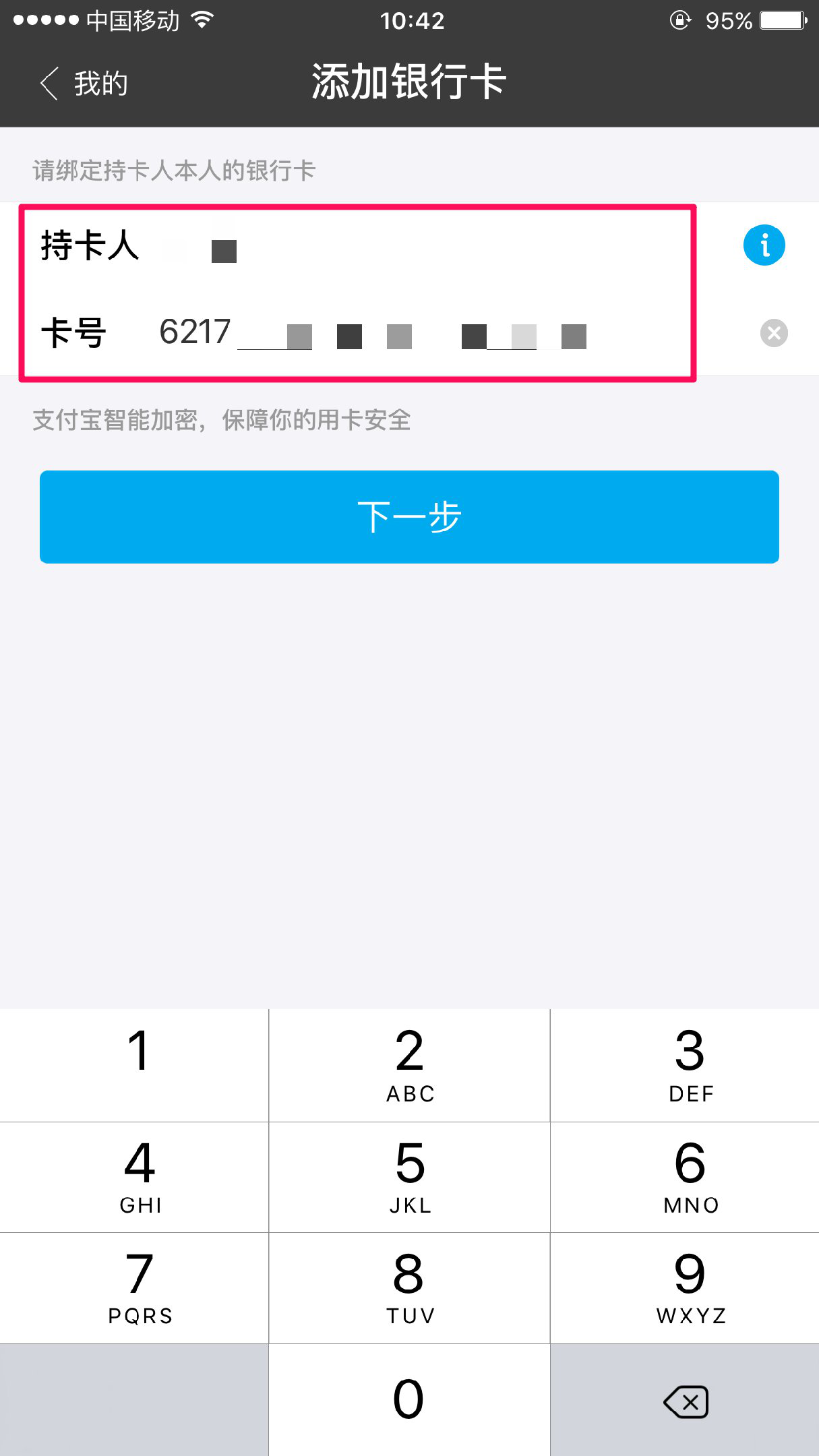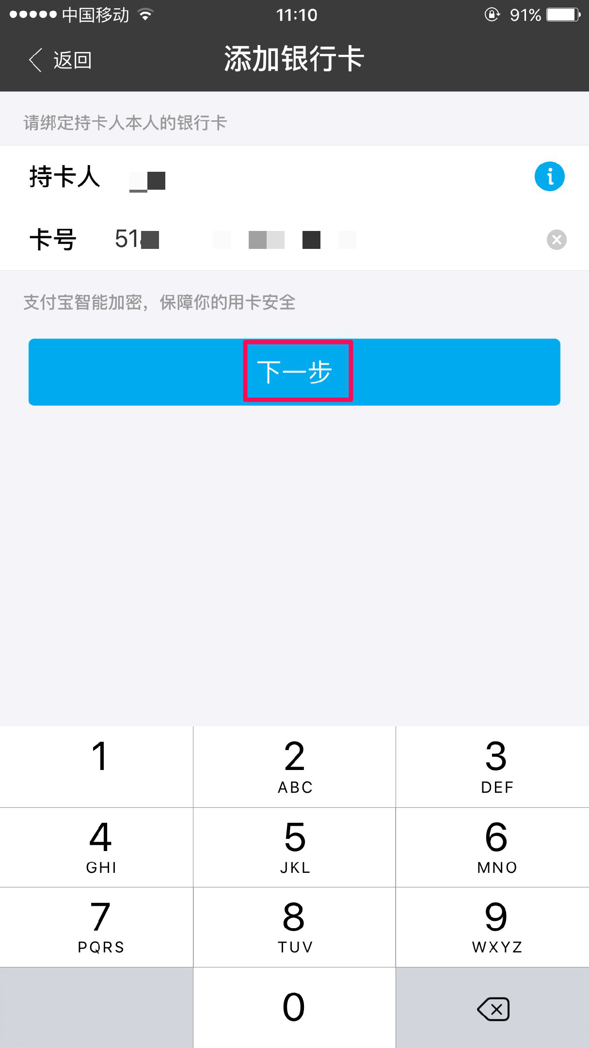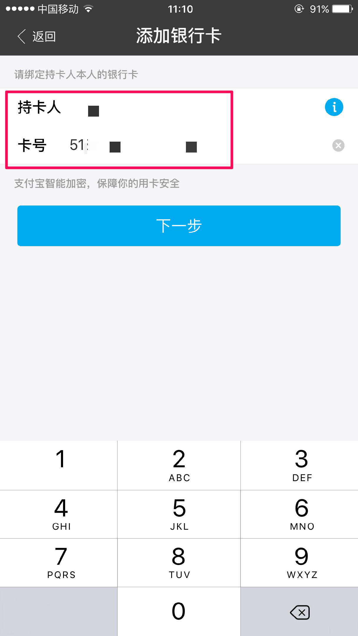 在红框内,输入持卡人的名字和卡号