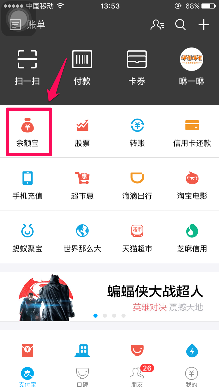 点击下图位置,选择要转入到余额宝的途径(银行卡或支付宝余额)。这里我们选择从银行卡内转入。