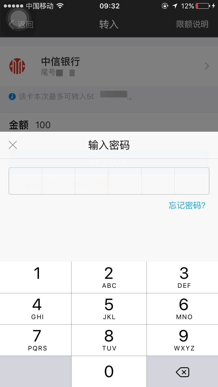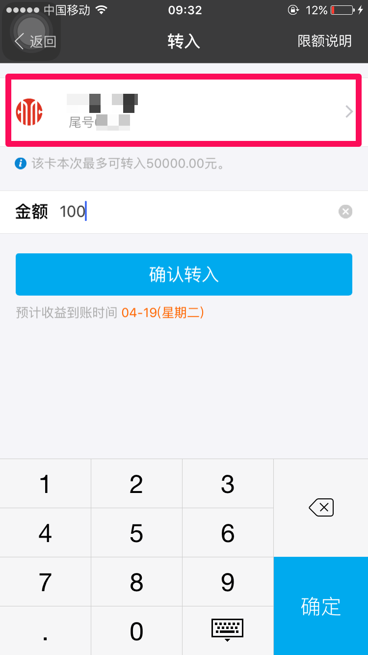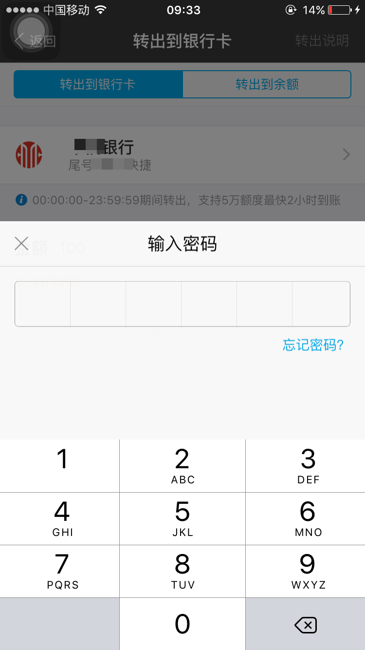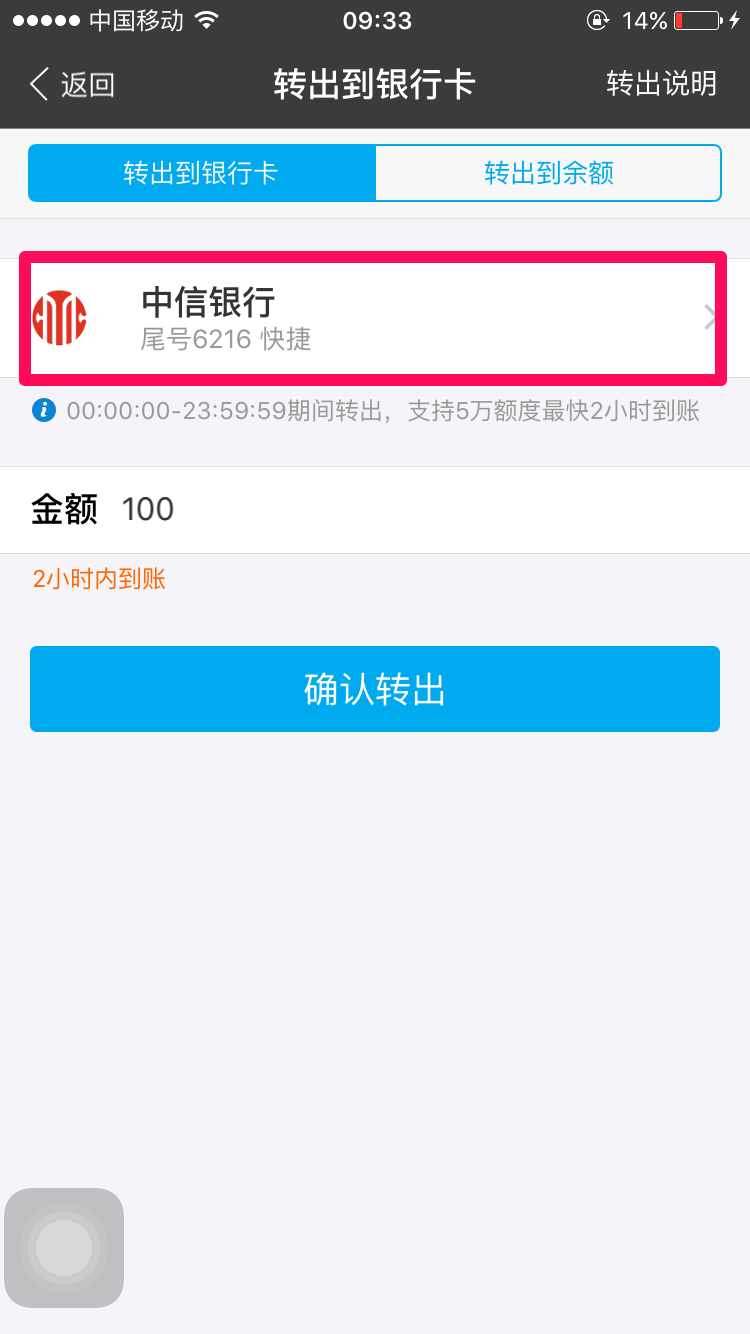 选好要转出的银行卡后,输入要转出的金额,点击确认转出