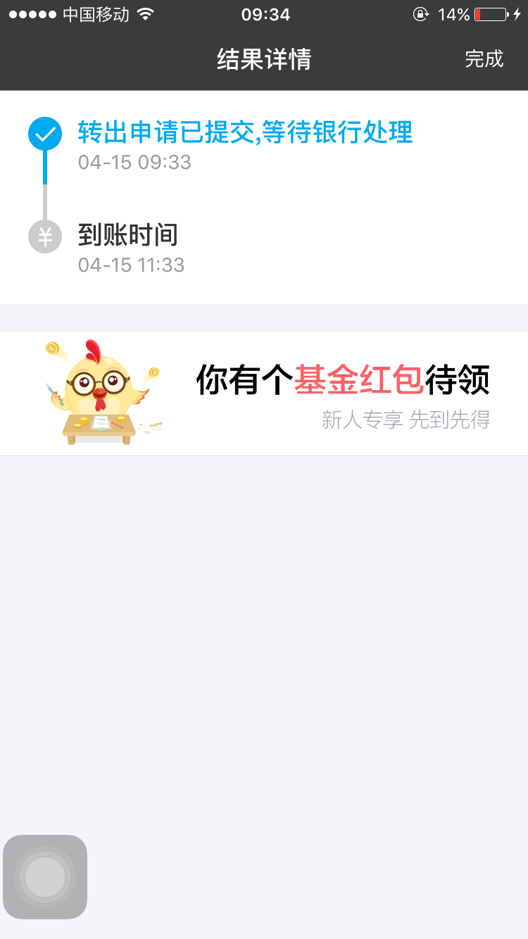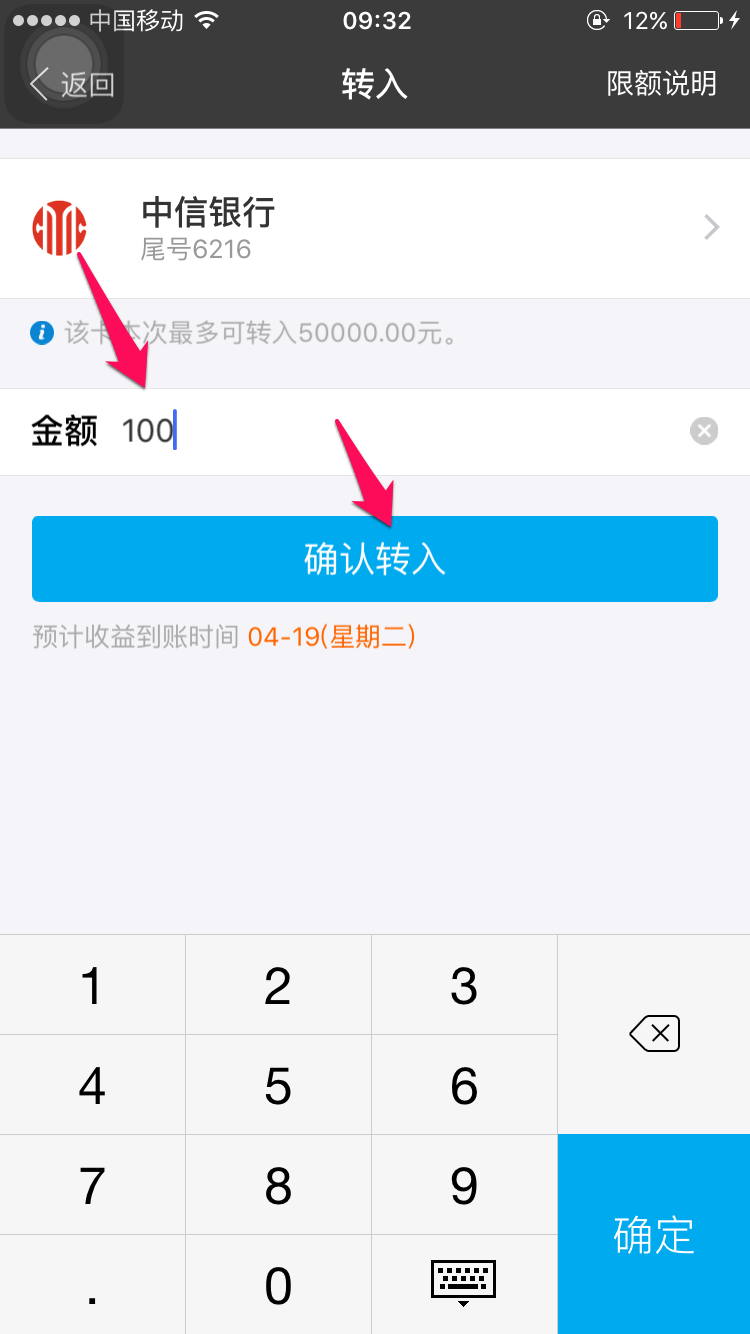 转账金额即时到账,并于3日后开始计算收益,第4天收益到账