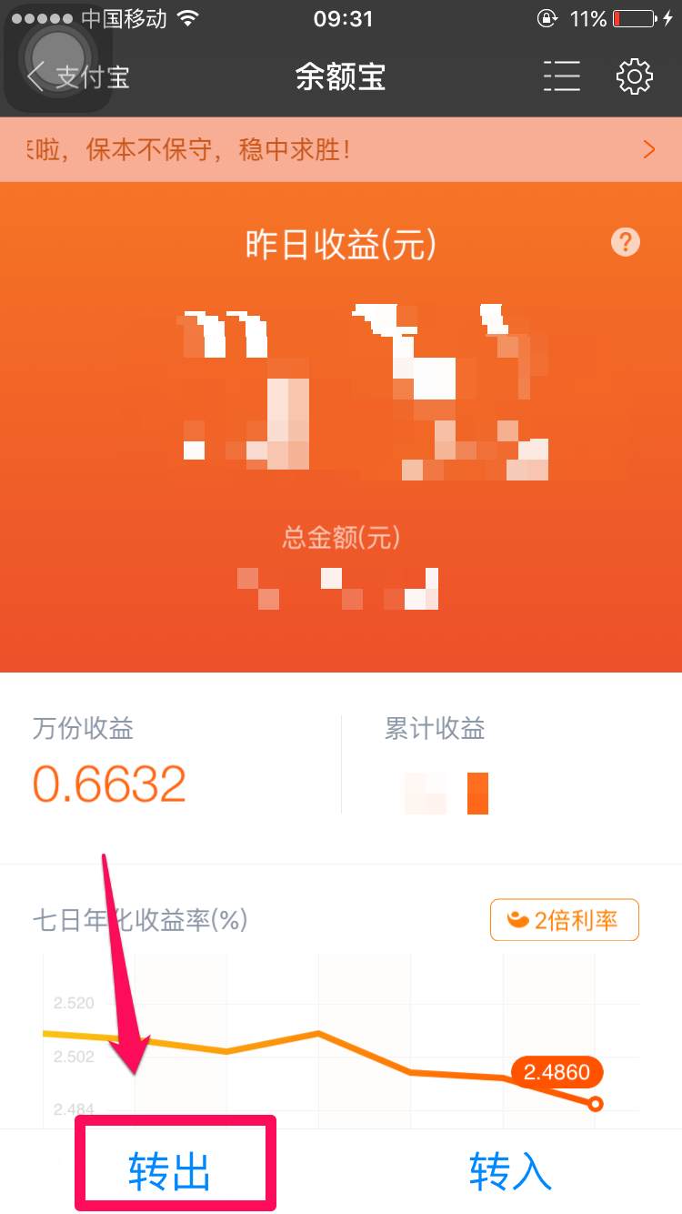选择“转出到余额”,输入要转出的金额,点击确认转出