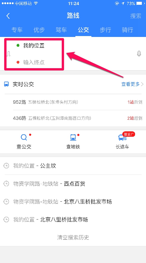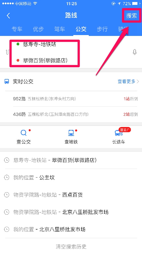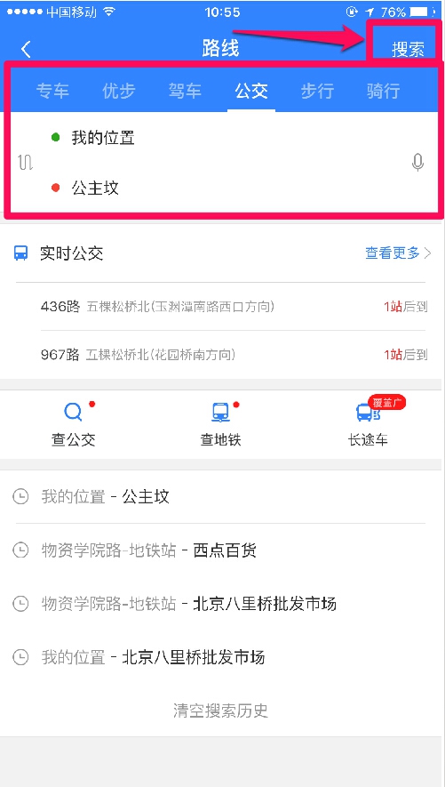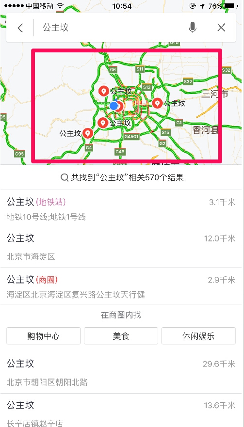 我们以从当前位置(五棵松)到公主坟为目的地进行路线查询,首先需要搜索要去往的目的地。如下图所示,在红框内搜索地点