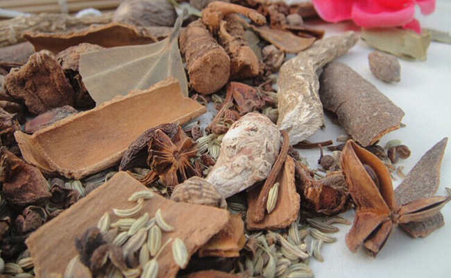 八角10克,桂皮5克,丁香2克,草果2克,甘草2克,香叶2克,沙仁 2克,山奈2克,小菌3克,精盐约20克,料酒50克,酱油50克,白 糖10克,味精10克,姜末20克,小麻油100克等。加清水或鲜汤1200克,小火烧开5分钟后加入味料并倒 入容器中,用小麻油封汁焖泡15分钟后即可使用。