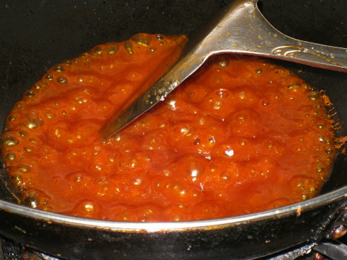 此糖醋汁常用于凉菜中的糖炙骨、熏鱼等,一般是将腌制入味的原料 炸热后用糖醋汁在锅中收上卤,出菜时再淋入此汁,糖醋汁在锅中熬 制时一定要有浓稠感为佳。