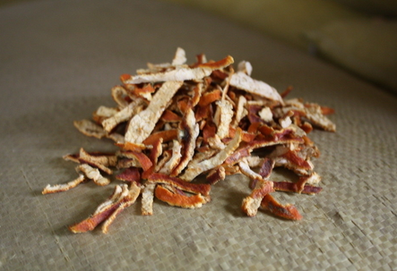 治咳嗽:用干橘皮5克,加水2杯水煎汤后,放少量姜末、 红糖趁热服用;也可取鲜橘皮适量,切碎后用开 水冲泡,加入白糖代茶饮,有化痰止咳之功效